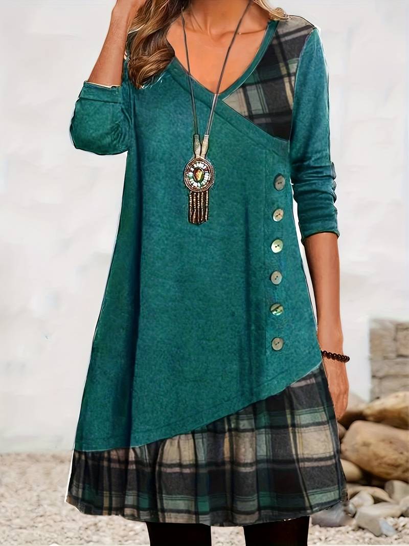 Alinor - Uformell Rutete Patchwork Kjole Med Lange Ermer
